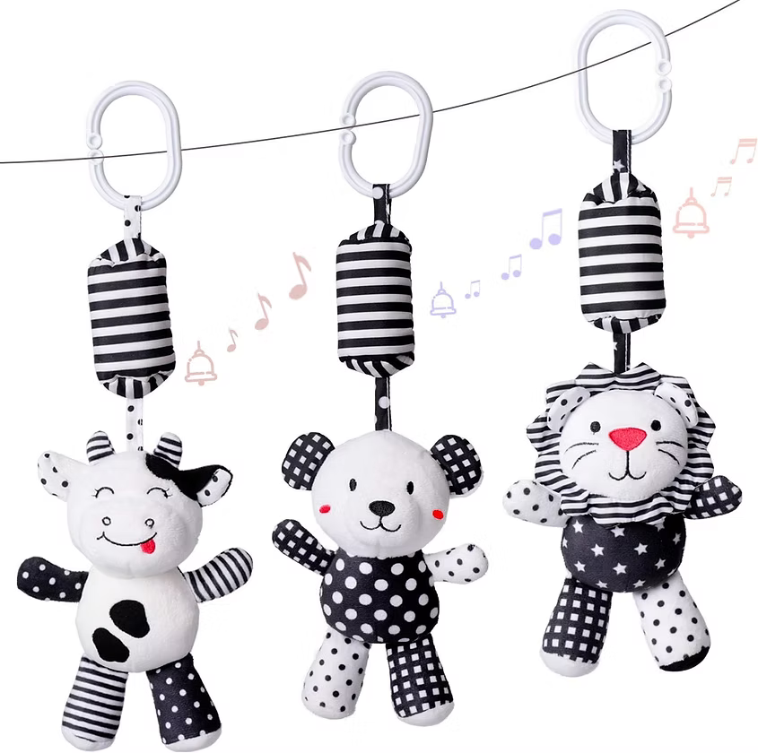 Accesorio/móvil para estimulación de bebé, en blanco y negro, con clip para guindar.