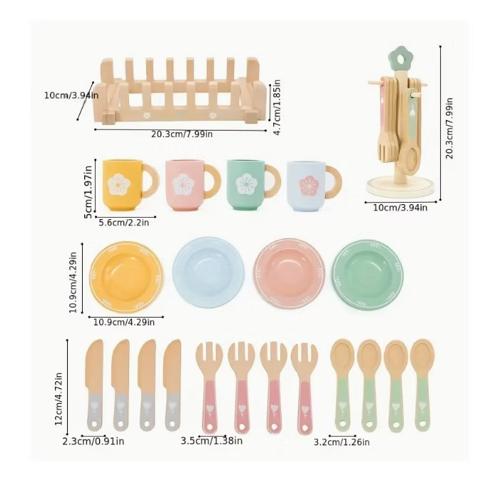 Juego de 4 puestos para comer, incluye 4 platos, tazas y cubiertos en madera con lindos colores pasteles.