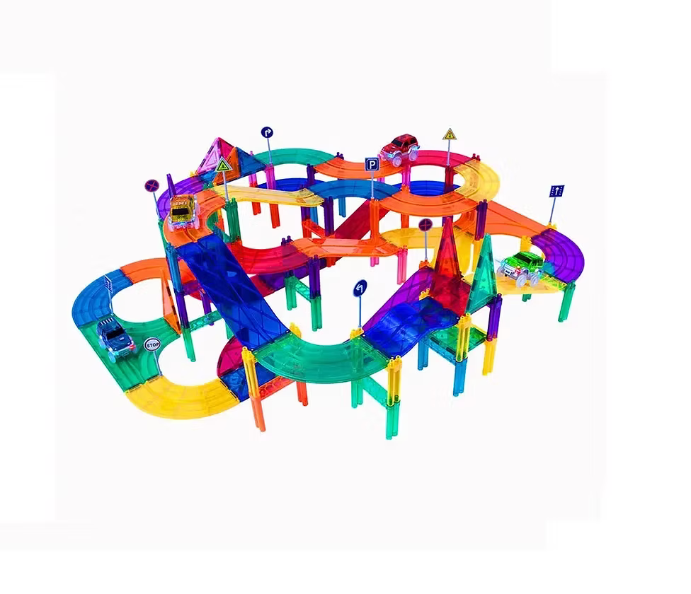 Pista de Magna tiles, formas magnéticas de diferentes colores y formas para carritos. Con suspensor de puentes y accesorios. Caja de 90 piezas. Incluye carritos automáticos