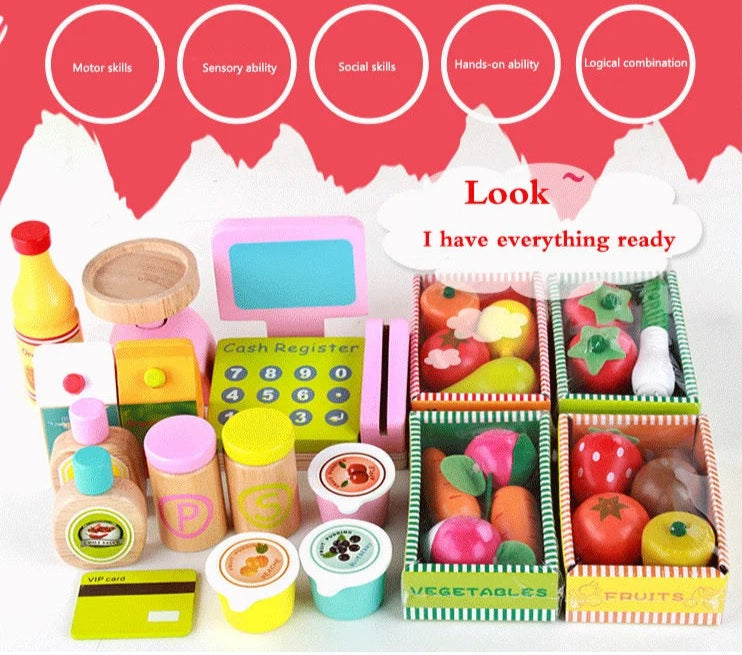 Supermercado de juego, en tamaño real, con su tolda, máquina registradora, canastas, comida, etc